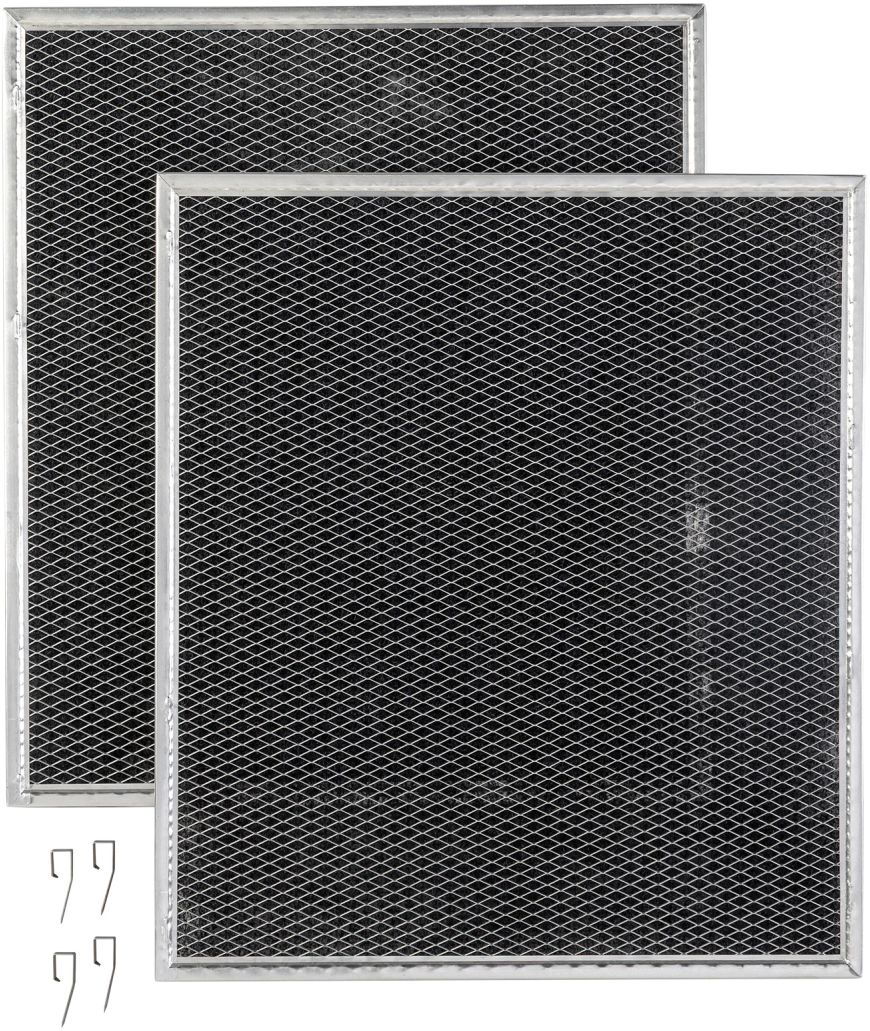 Includes (2) charcoal filters and (4) clips, which are used in conjunction with the range hood's aluminum filters
