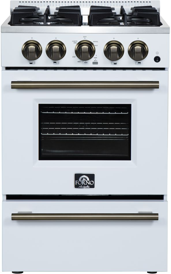 The Forno Breno 24 Inch Gas Range in White with Antique Brass Knobs adds a bold, vintage-inspired look to any small kitchen. It features 4 sealed burners with a total cooktop output of 38,000 BTUs and a 13,000 BTU oven for everyday cooking power. The 2.30 cu. ft. oven includes bake and broil elements, plus an air fryer basket for added versatility. Matte cast iron grates provide durability and even heat distribution. Includes leveling legs, a storage drawer, and an LP conversion kit. Ideal for apartments, condos, or compact cooking spaces.Read More