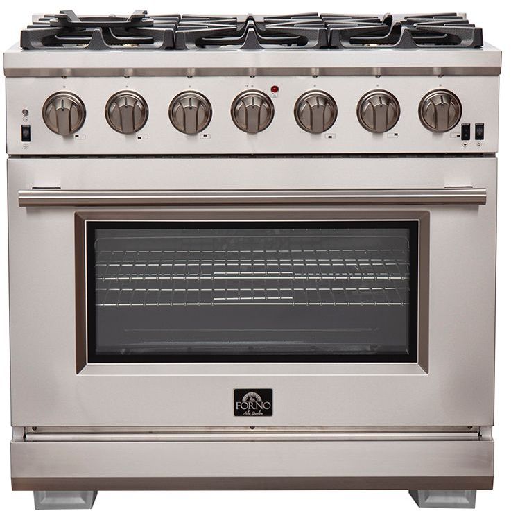 The Forno Capriasca 36 Inch Gas Range enhances your home kitchen with professional styling and performance through its durable and beautiful 304-grade stainless-steel design. The cooking surface features 6 sealed dual-ring brass burners, totaling 120,000 BTU. All burners, each at 20,000 BTU, can simmer precisely at 1,000 BTU. Continuous heavy-duty cast-iron grates facilitate easy sliding of pots or pans off heat over the enamel cooktop cavity, simplifying spill cleanup. The 5.36 cu. ft. gas oven, with a 30,000 BTU output and infrared red mesh broiler, enclosed in a blue enamel interior, offers optional convection for precise, and consistent cooking on multiple levels. For convenient viewing, a 3-layer glass oven door window is included. The package includes 3 telescopic stainless-steel oven racks, wok support, and an LP conversion kit. Additionally, zinc-coated illuminated metal knobs with bezel rings ensure enduring beauty.Read More