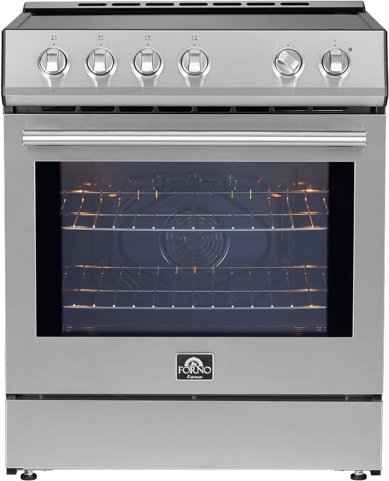 The FORNO Leonardo Espresso 30-Inch stainless steel induction range elevate your cooking experience with this perfect blend of style, functionality, and reliability. Experience the efficiency of our powerful 8,100-watt induction elements, designed to deliver optimal cooking performance. The 5 cu. ft. convection oven boasts a high-performance convection fan and a broil and bake output of 3,500 watts. With two oven racks at your disposal, explore endless culinary possibilities with ease. The speckled blue enamel interior guarantees consistent heat absorption and retention, ensuring every dish is cooked to perfection. Effortless operation is ensured by friction-resistant hinges, while the hidden bake element prevents spills, simplifying maintenance. Skip the high price tags without sacrificing quality and performance. Lower the cost of living with Forno.Read More