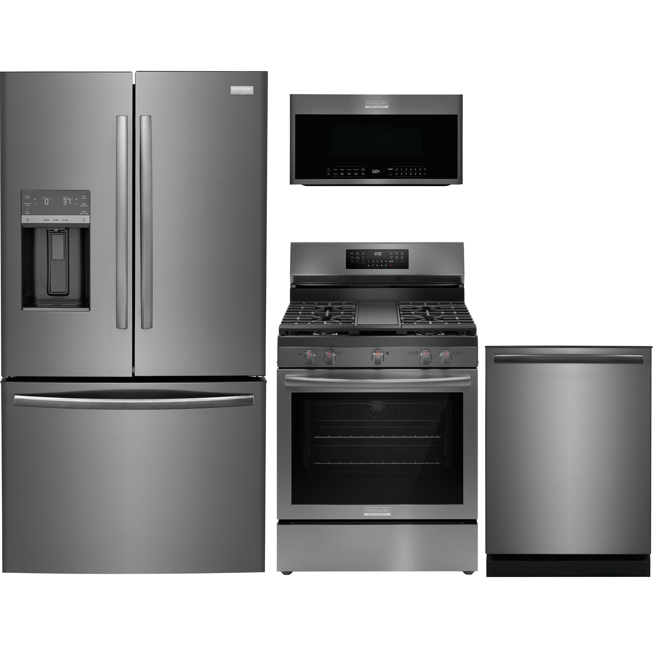 Frigidaire 4 Piece Kitchen Package Black Stainless Steel with French Door Refrigerator, Free-Standing Gas Range, Built In Dishwasher, and Over The Range Microwave.Read More