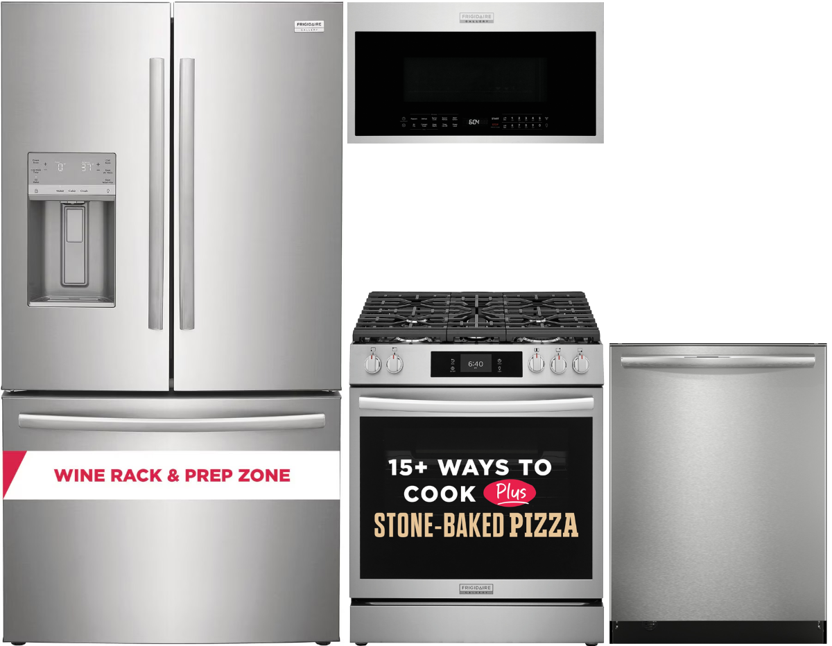 Frigidaire Gallery 4 Piece Stainless Steel Kitchen Package with French Door Refrigerator, Slide-In Gas Range, Built-In Dishwasher, and Over-The-Range Microwave.Read More
