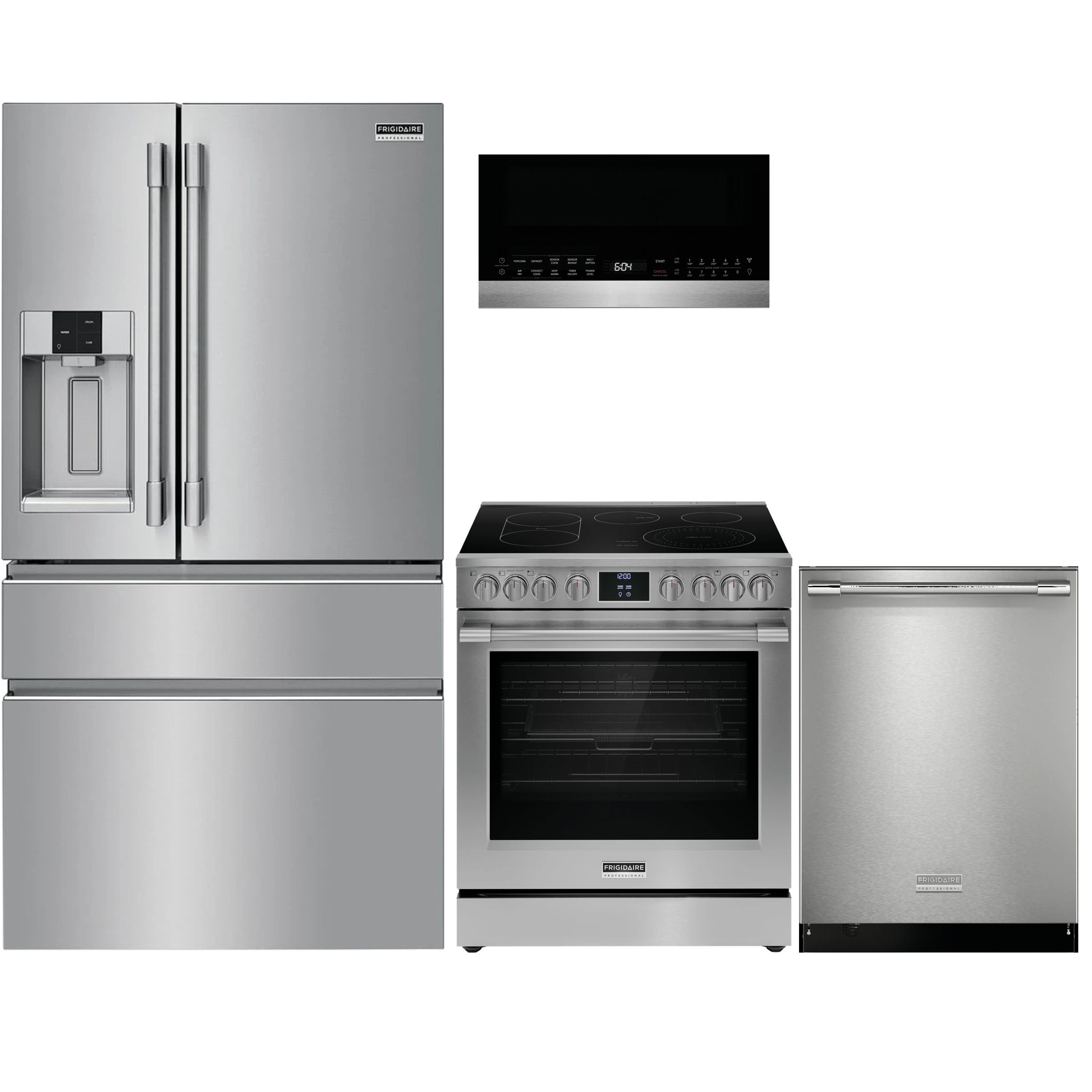 Frigidaire Professional® Stainless Steel Kitchen Package with four door refrigerator, free-standing electric range, built in dishwasher, and over the range microwave.Read More