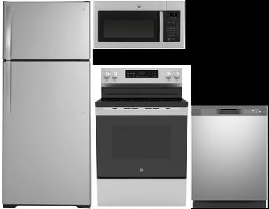GE® 4 Piece Stainless Steel Kitchen Package with Top-Mount Refrigerator, Free-Standing Electric Range, Built-In Dishwasher and Over-the-Range Microwave.Read More