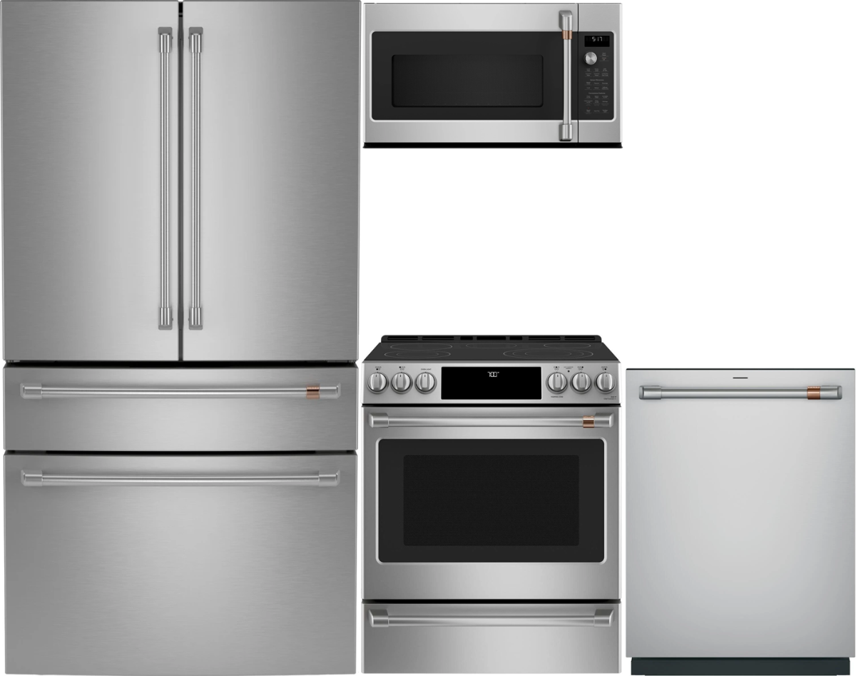 GE Café 4 Piece Stainless Steel Kitchen Package with a four door refrigerator, slide-in electric range, built-in dishwasher and over-the-range microwave.Read More