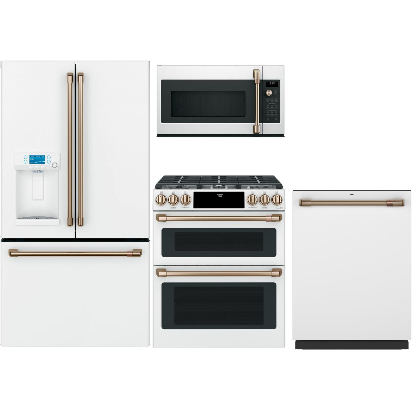 GE Café 4 Piece White Matte Kitchen Package with a french door refrigerator, slide-in gas range, built-in dishwasher and over-the-range microwave.Read More