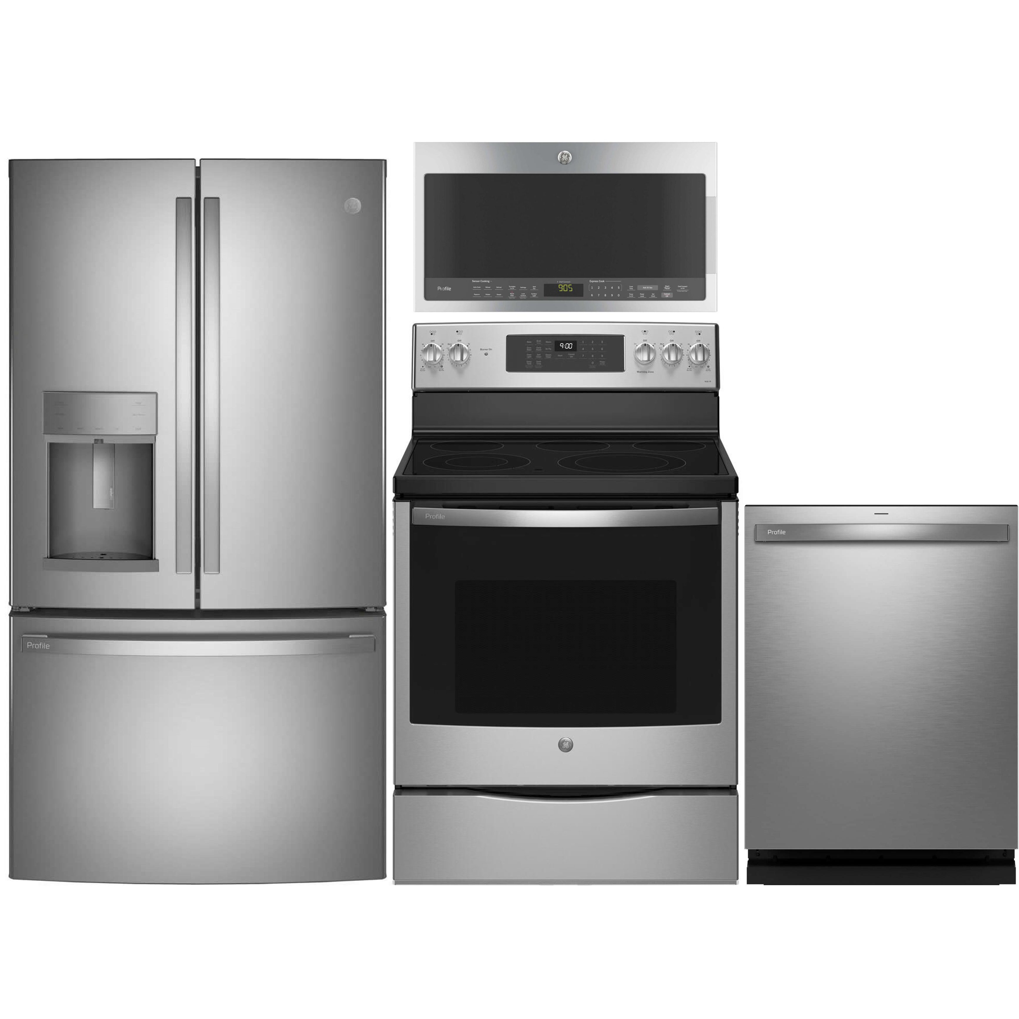 GE Profile™ 4 Piece Stainless Steel Kitchen Package with a french door refrigerator, free-standing electric range, built-in dishwasher and over-the-range microwave.Read More