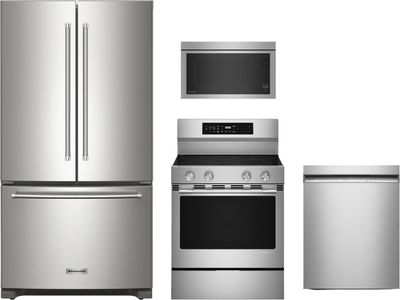 KitchenAid® 4 Piece Stainless Steel Kitchen Package with a French door refrigerator, freestanding electric range, over the range microwave and built in dishwasher.Read More