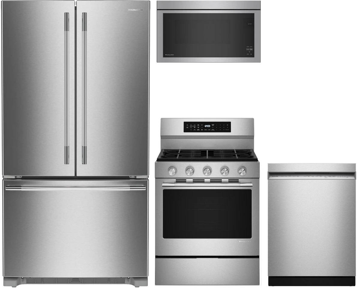 KitchenAid® 4 Piece Stainless Steel Kitchen Package with a Four door refrigerator, free-standing gas range, built-in dishwasher and over-the-range microwave.Read More