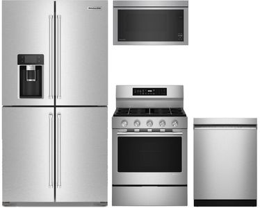 KitchenAid® 4 Piece Stainless Steel Kitchen Package with a Four door refrigerator, free-standing gas range, built-in dishwasher and over-the-range microwave.Read More