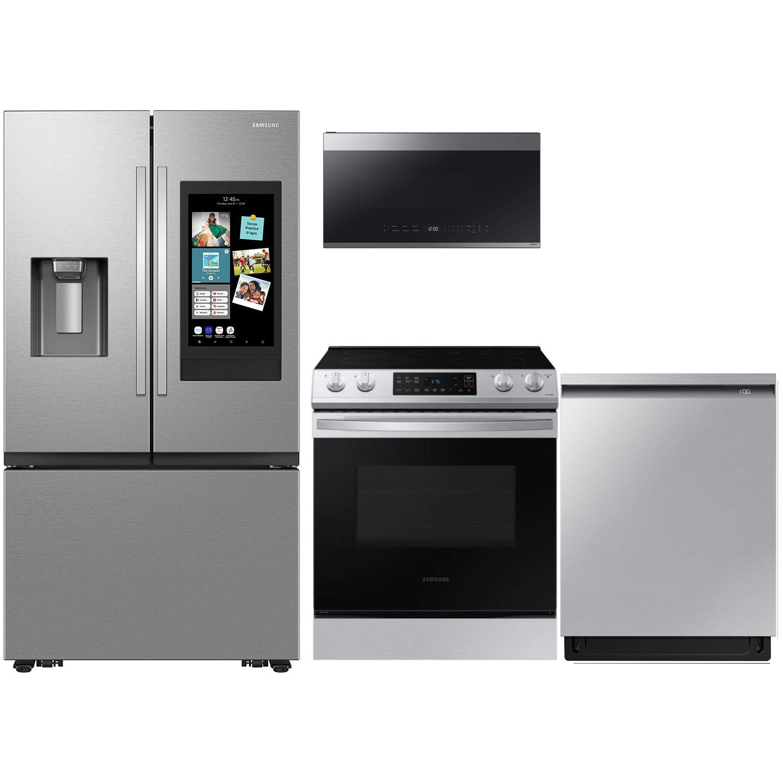 Samsung 4 Piece Kitchen Package Fingerprint Proof Stainless Steel with a french door refrigerator, free-standing electric range, built-in dishwasher and over-the-range microwave.Read More