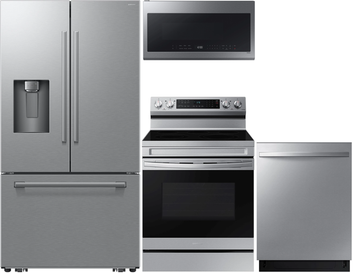 Samsung 4 Piece Kitchen Package Stainless Steel with a french door refrigerator, free-standing electric range, built-in dishwasher and over-the-range microwave.Read More