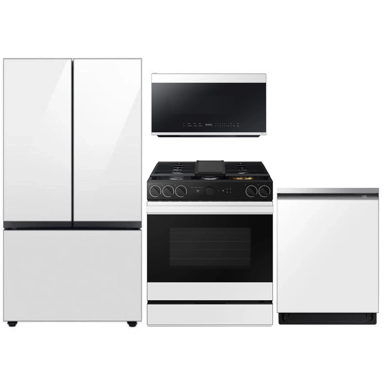 Samsung Bespoke 4 Piece White Glass Kitchen Package with a french door refrigerator, free-standing gas range, built-in dishwasher and over-the-range microwave.Read More