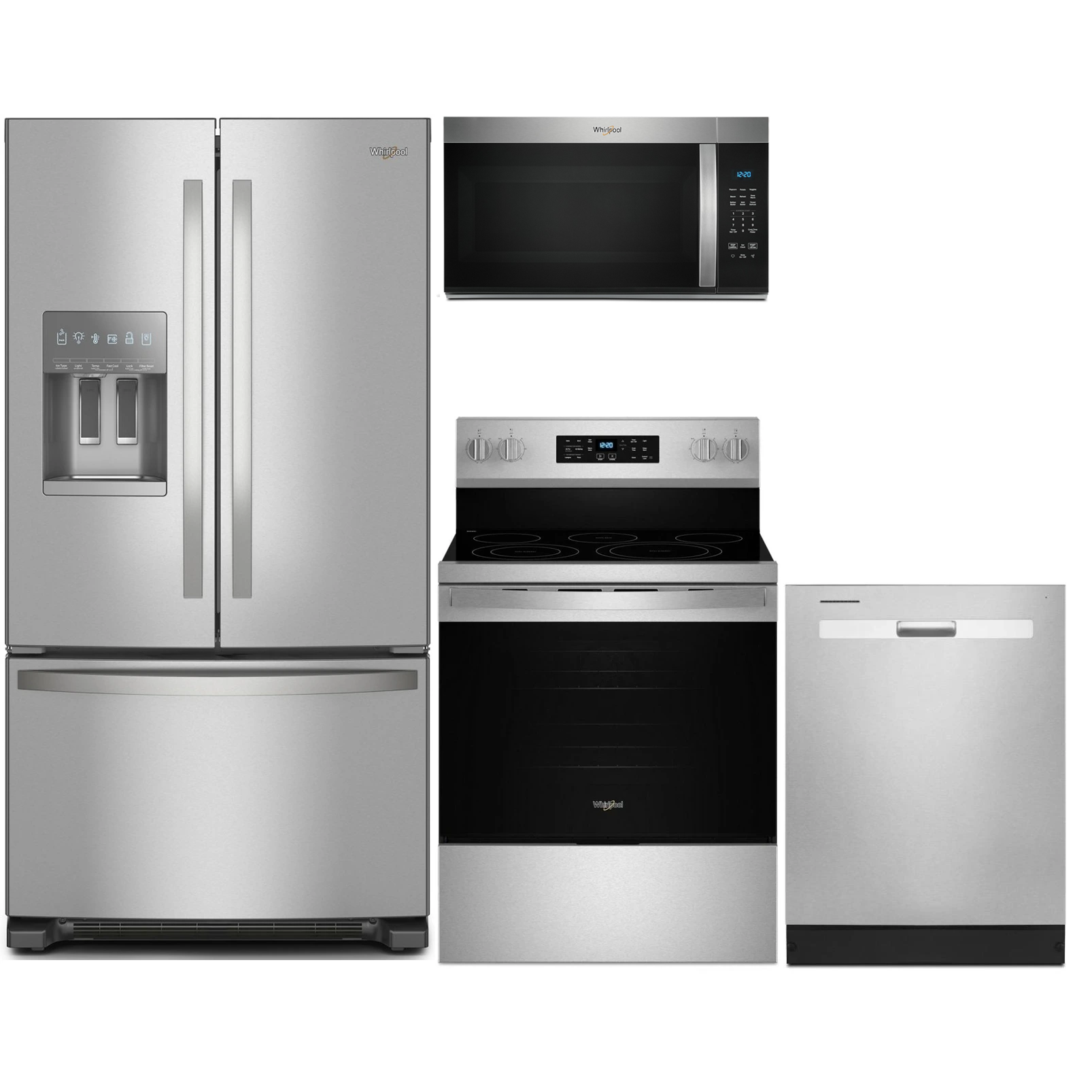 Whirlpool® 4 Piece Kitchen Package-Stainless Steel with a french door refrigerator, free-standing electric range, built-in dishwasher and over-the-range microwave.Read More